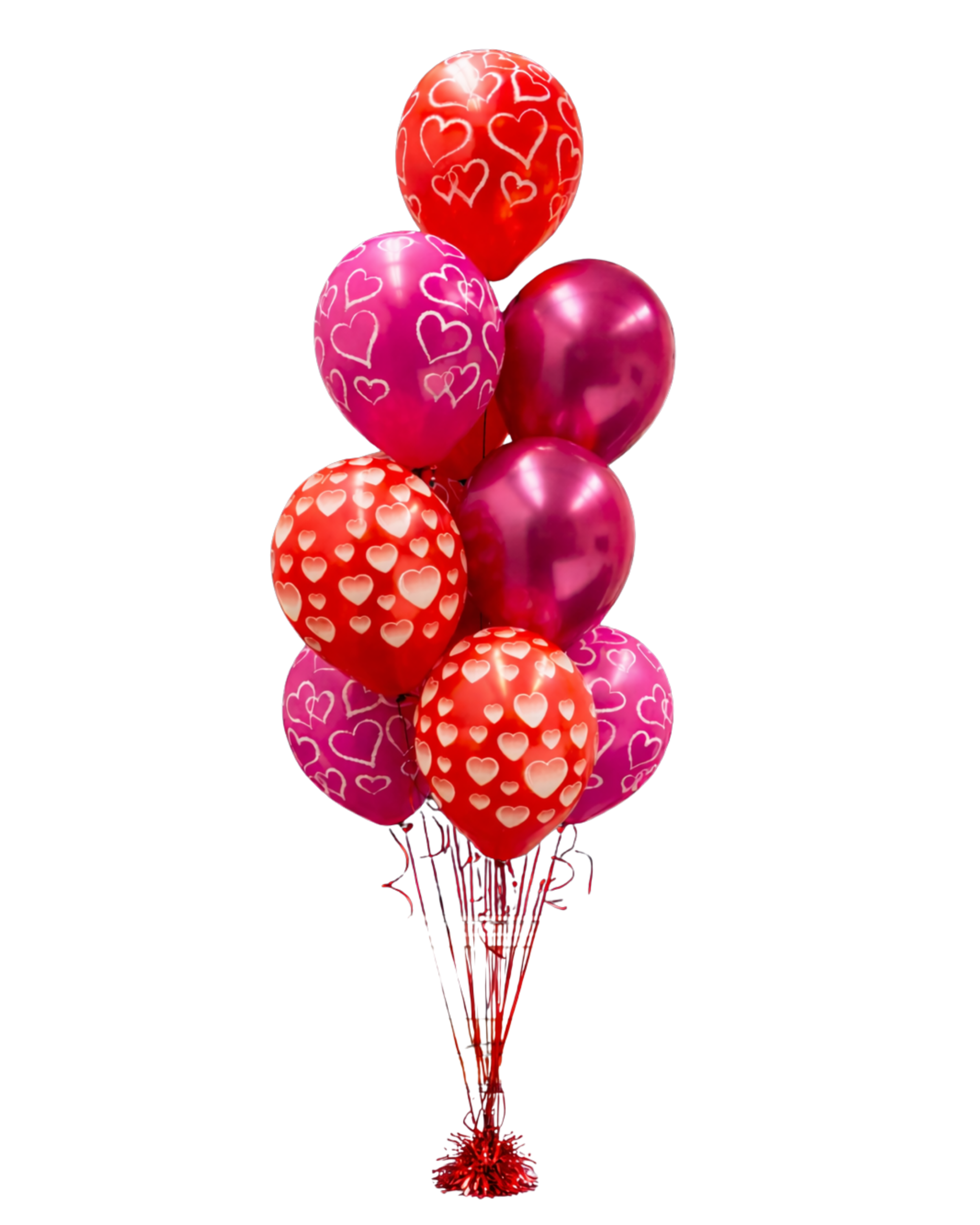 En munter og romantisk ballongbukett laget utelukkende av lateksballonger i livlige nyanser av rødt og rosa. Ballongene har vakre hjertetrykk og blanke overflater, noe som skaper et festlig og kjærlighetsfylt utseende perfekt for Valentinsdagen. Buketten er fylt med helium og behandlet med Ultra High Float for at ballongene skal vare lenger. En fin gaveoverraskelse eller dekorasjon for å feire noen spesielle. Hver bukett er håndlaget, så små variasjoner kan forekomme sammenlignet med bildet som vises.