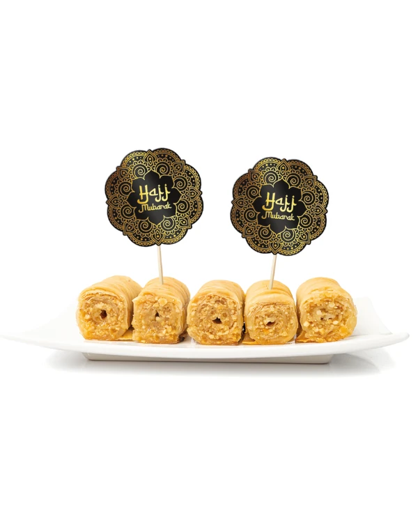 Fullfør feiringen av en fullført pilegrimsreise med disse eksklusive pinnene prydet med teksten “Hajj Mubarak”. Den tidløse kombinasjonen av svart og skinnende gull gir serveringen et luksuriøst og verdig preg som virkelig ærer den store begivenheten. De er perfekte for å pynte opp dadler, småretter eller fingermat når du ønsker pilegrimer velkommen hjem, og de tilfører en elegant rød tråd til hele festbordet.