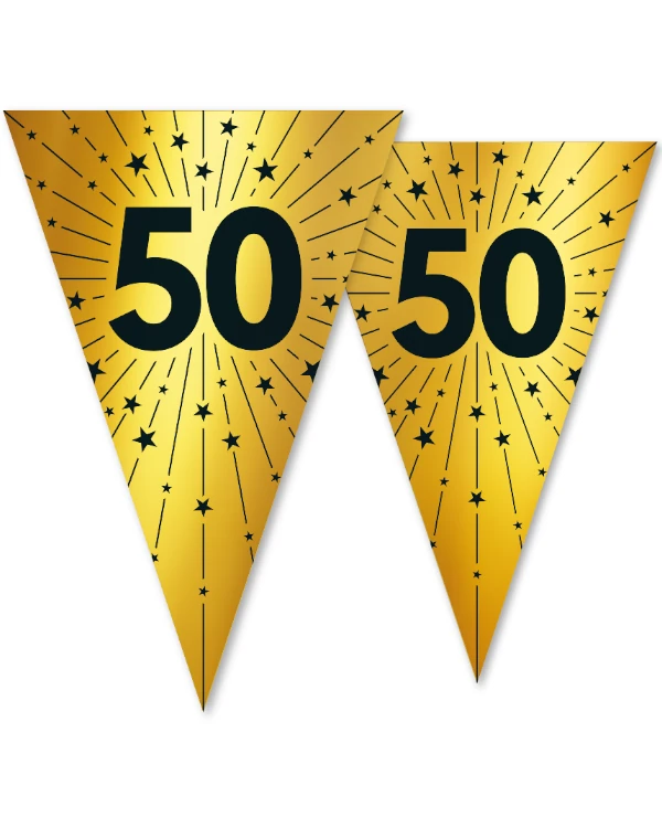 Elegant girlander med trekantede vimpler i gullfarget design. Hver vimpel har tallet 50 trykket stort og tydelig øverst i midten, omgitt av svarte stjerner og en dekorativ stråleeffekt som gir et eksklusivt og festlig uttrykk.