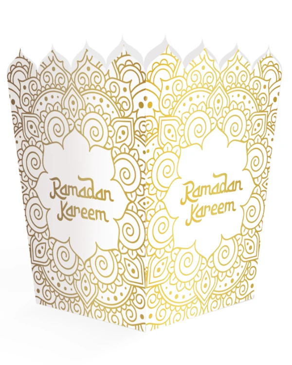 Praktiske og dekorative godtebeger med teksten Ramadan Kareem. Ideelle til snacks og søtsaker under Ramadan. Pakken inneholder 8 stk.
