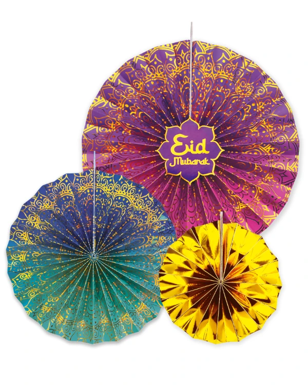 Dekorative honeycomb hengedekorasjoner i fargerikt design med Eid Mubarak-tema. Perfekt til å skape dybde og festlig atmosfære i rommet. Pakken inneholder 3 stk.