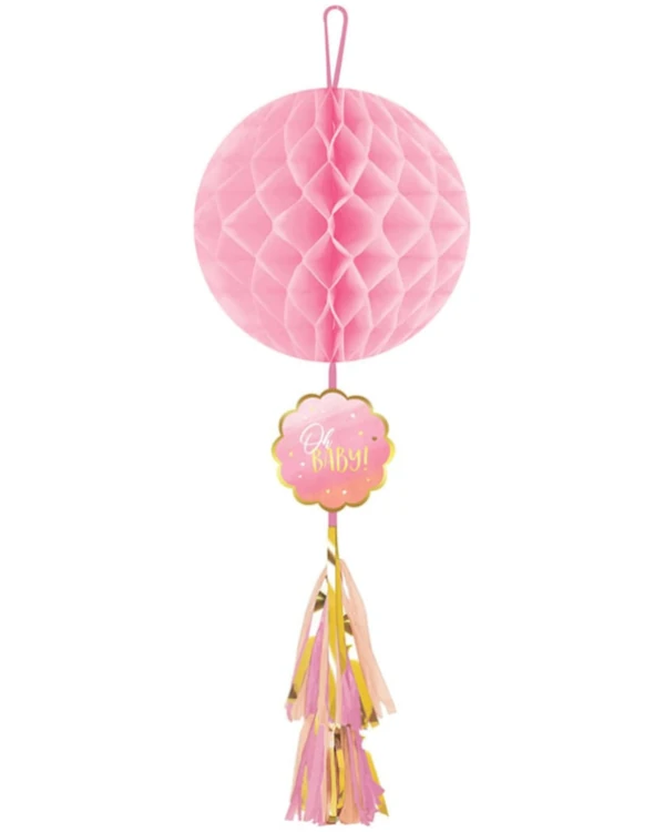 Stor honeycomb-dekorasjon med teksten Oh Baby, dusker og detaljer i rosa og gull. Perfekt til babyshower eller gender reveal, og gjør seg flott både hengende fra taket eller som del av en ballongbue. Dekorasjonen måler hele 74,9 cm og gir en iøynefallende og festlig effekt. Kombiner gjerne med matchende servietter, kopper og ballonger for et komplett uttrykk.
