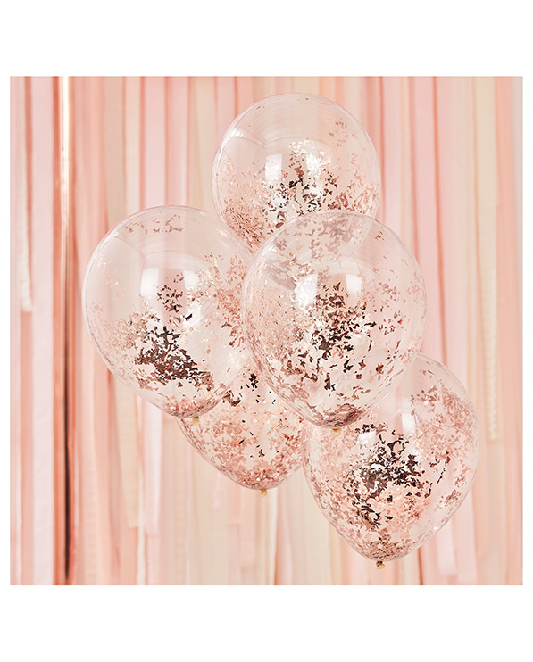 5 stk gjennomsiktige lateksballonger på 30 cm. Ballongene har roségullfarget glitter inni seg. Lekre ballonger som passer perfekt som dekorasjon på alle slags festligheter. Alle våre lateksballonger er nedbrytbare på link linje med et eikeblad.