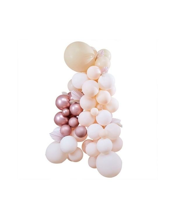 Hold det fersken med dette nydelige hvite, fersken- og rosegullballongbuesettet. Hver pakke inneholder 70 ballonger samt vifter og løvkvister
