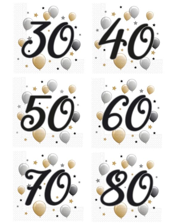 Gjør den store dagen uforglemmelig med våre feststemte servietter, spesialdesignet for livets viktigste milepæler. Hver pakke inneholder 20 kvalitetsservietter i størrelsen 33 x 33 cm, prydet med det spesifikke jubileumstallet i sentrum.